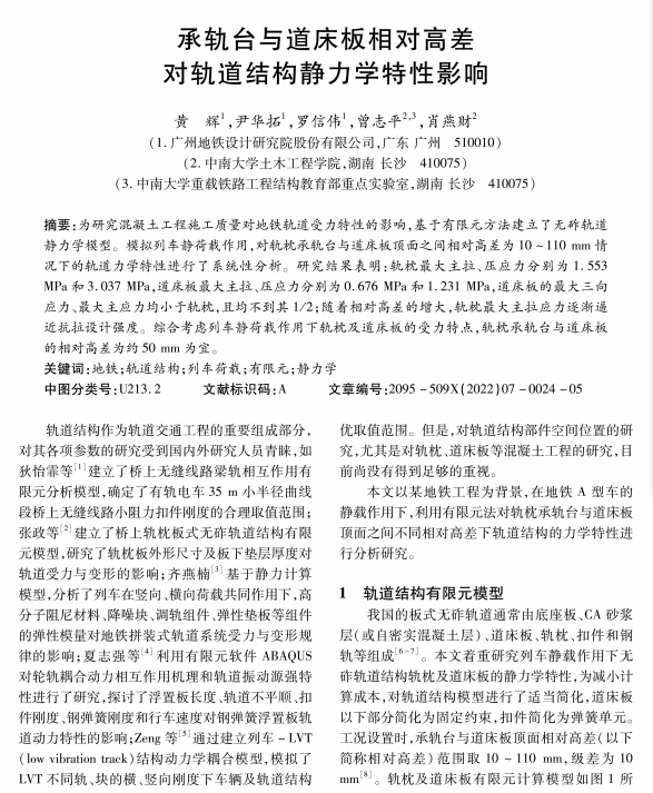 承轨台与道床板相对高差对轨道结构静力学特性影响