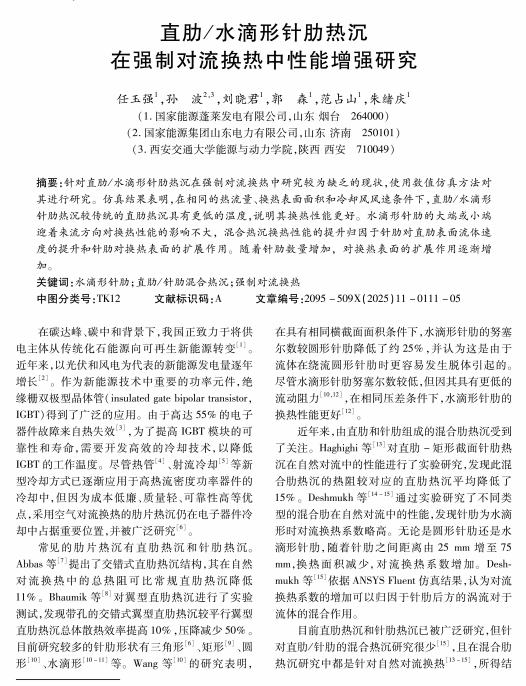 直肋/水滴形针肋热沉在强制对流换热中性能增强研究
