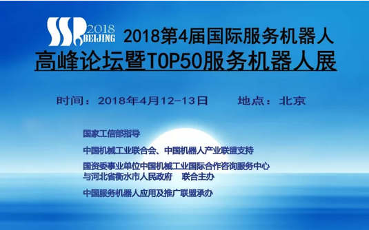 为共享服务机器人产业带来的发展机遇,共同迎接挑战,继续推动服务机器人产业跨界融合,共创服务机器人产业共生生态,在工信部指导、中国机械工业联合会和中国机器人产业联盟支持下,中国机械工业国际合作咨询服务中心、中国服务机器人应用及推广联盟联合河北省衡水市人民政府,将于2018年4月在北京举办第四届国际服务机器人产业高峰论坛。