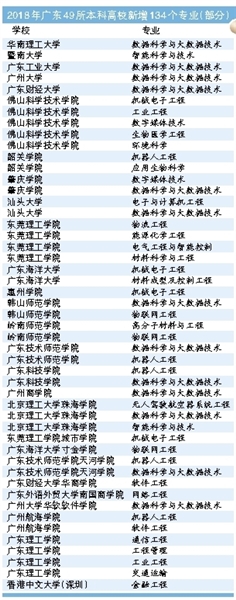 梳理近两年广东高校新开设的专业不难看出,新理工科专业蹿红,成为各个高校开设专业中的主流。以广东省为例,2017年广东省49所高校144个本科专业获得教育部批准,其中理工类专业86个,占比59.7%。今年广东49所本科高校新增134个专业,新增的专业中,同样是理工类成为主打。