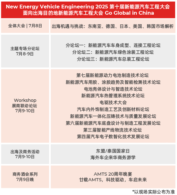 NEV Engineering 2025 第十届新能源汽车工程大会全新出发,打造:面向出海目的地的新能源汽车工程大会,结合主办方励展全球化汽车产业合作资源,预计将吸引4,000名中国及1,000名来自东南亚、日本、韩国、德国、美国、印度及其他海外目的地车企、产业协会园区政府机构等领域的行业精英,共同探讨新能源汽车车身,绿色涂装、总装、三电工程及零部件制造工程领域的前沿技术、市场趋势、以及出海目的地的政策法规及合作机遇,为行业精英提供一个不出国门即可深度参与的国际交流盛会。