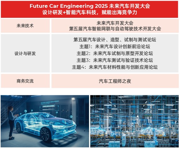 Future Car Engineering 2025未来汽车开发大会将聚焦智能网联与自动驾驶技术、汽车设计、造型、试制与测试等核心的前沿技术与解决方案,汇聚全球汽车设计研发领域的精英,打造一场技术、生态、商业深度融合的国际盛会,预计将吸引1,000名中国及500名来自 海外的汽车设计研发人员。