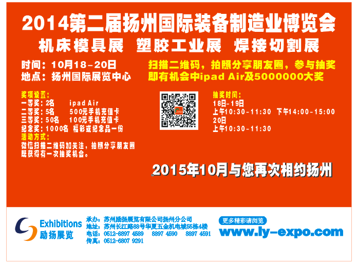 第二届扬州机床展将是一场参与人数众多:近20000名专业观众;展商数量破历届苏北展会之最:近300家名企参与;受关注程度最高:10余家电视台、广播电台、报纸,100家网络媒体及期刊杂志的强势宣传报道;扬州机床展”品牌早已声名远扬,辐射半径涵盖江浙沪鲁晥等机械产业密集地区。10月18-20日让我们相会在扬州共同见证行业奇迹!