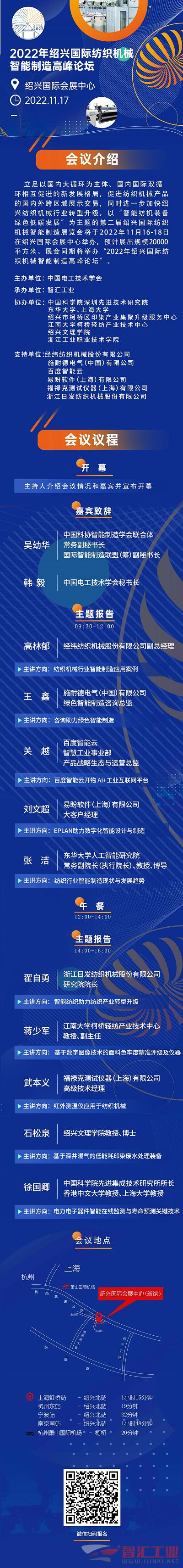 11月17日,展会同期将举办“2022年绍兴国际纺织机械智能制造高峰论坛”。论坛由中国电工技术学会主办,智汇工业承办,中国科学院深圳先进技术研究院、东华大学、上海大学、绍兴市柯桥区印染产业集聚升级服务中心、江南大学柯桥轻纺产业技术中心等单位协办与支持。本届论坛汇聚诸多纺织机械及智能制造领域的重量级嘉宾,旨在助力纺织机械行业在高端化、智能化发展路线上持续迈进。