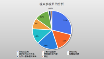 从往届观众的参观目的分析来看,寻找供应商的占29%;了解最新行业趋势和前沿技术的占16%;采购相关设备与产品占18%;维护与合作伙伴、现有供应商的关系占13%;寻找潜在合作者占9%;加盟或代理销售占12%;前来参观为下一届参展做准备的展商占到2%;其它1%。