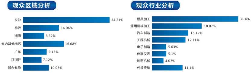 展会期间,共接待来自湖南、湖北、广东、江苏、浙江等地的专业观众5000余人次,组团参观企业37家,其中70%以上为长沙、株洲、湘潭、武汉等中部装备制造规模企业,如株洲南车、广汽三菱、三一重工、同心模具、铁建重工、晓光模具、九方装备、中联重科、博世汽车、圣园焊接、江麓精密机械、礼恩派拉线、广汽长丰、株洲方远航空铸造、长沙阿斯铁亚伍亨、北汽福田、固特机电模具、宇环智能装备、全亚物流装备、益阳橡胶塑料机械集团、益阳福祥农业装备、磐吉奥、中铁五局、长沙矿山研究院、湖南中南黄金冶炼、耐普泵业、湘联节能科技、湖大三佳、株洲振邦实业等。