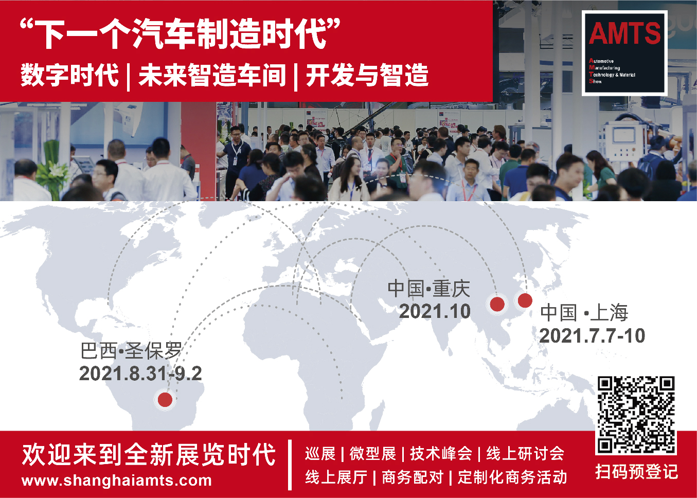 更多现场精彩,敬请期待。 布局全球 AMTS 2021开启品牌系列展/会 除上海站以外,2021年,AMTS的系列品牌展会及会议还将布局全球,陆续登陆:巴西圣保罗(2021.08),中国重庆(2021.10)等国家和地区。全“新”战略布局,从点到面覆盖汽车工程市场各地需求。