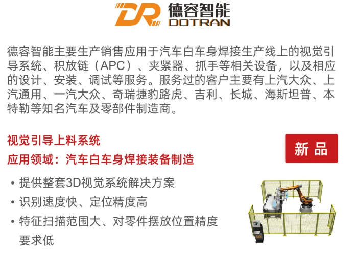 在机器视觉被大家熟悉的年代中,可视化焊接技术能够检测和感受外部信号和物理条件,并将检测到的信息传输给其他设备或设备为了满足信息传输、处理、存储、显示、控制等要求。首次来到AMTS 2021的上海德容智能科技有限公司(AMTS 2021 展位号:W2-E01)在AMTS 2021 将带来全新视觉引导上料系统,通过先进的整套3D视觉系统解决方案,可以提高机械手臂的识别速度,增强其定位精度。同时,拥有更大特征扫描范围的视觉引导上料系统,对零部件摆放的精度位置要求也大大降低,实现如同人眼般的可视化操作。该系统应用于白车身的焊接装备制造,让连接“看得见”。