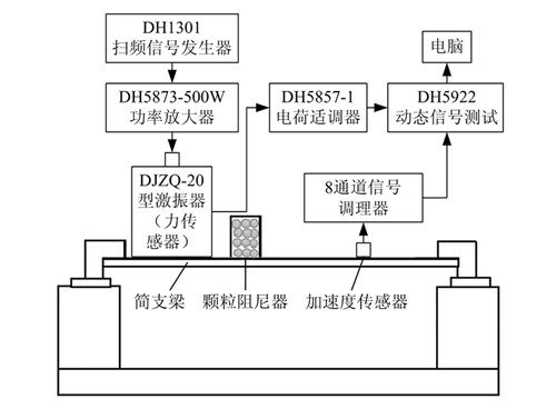 扫频信号发生器发出的正弦信号通过DH5873-500W功率放大器放大后输入到DJZQ-20型激振器,由激振器激励简支梁产生振动。简支梁振动时,用加速度传感器测量其振动响应,加速度传感器的电荷信号通过电荷放大器输入到DH5922信号分析系统,最后通过电脑上的DHDAS基本控制分析软件记录数据。