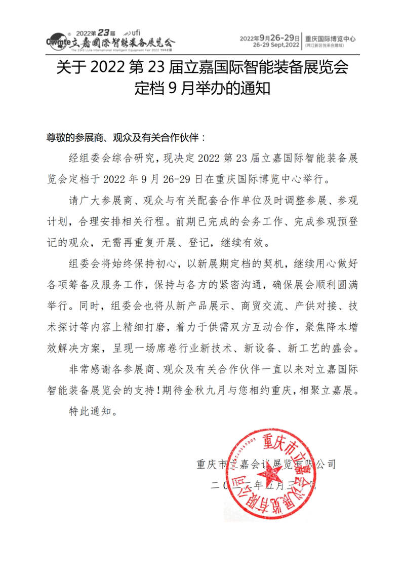 关于2022第23届立嘉国际智能装备展览会定档9月举办的诵知