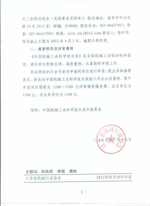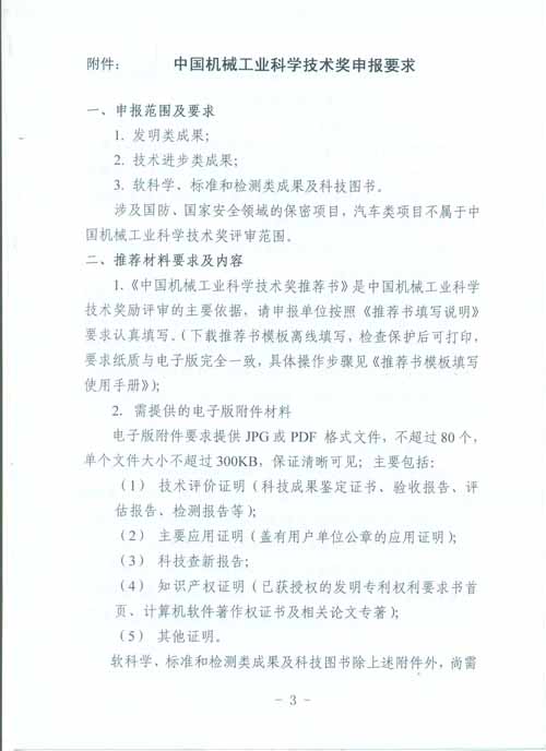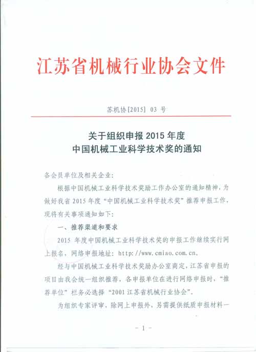 关于组织申报2015年度中国机械工业科学技术奖的通知