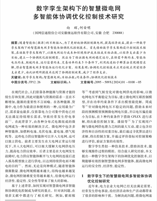 数字孪生架构下的智慧微电网多智能体协调优化控制技术研究