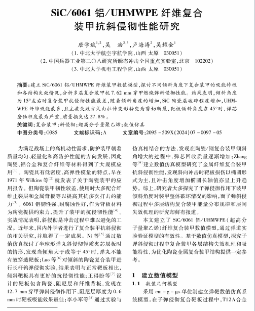 SiC/6061铝/UHMWPE 纤维复合装甲抗斜侵彻性能研究