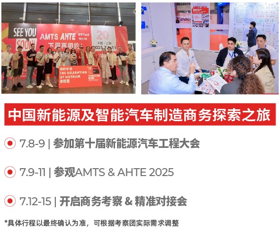 AMTS 2025 同期活动特别策划了多场海外车企来华商务考察之旅,以“深度参访+精准对接”模式,助力海外车企精准把握中国新能源汽车与智能汽车产业的蓬勃动能与独特生态,解锁中国新能源车企致胜密码,实现降本增效。