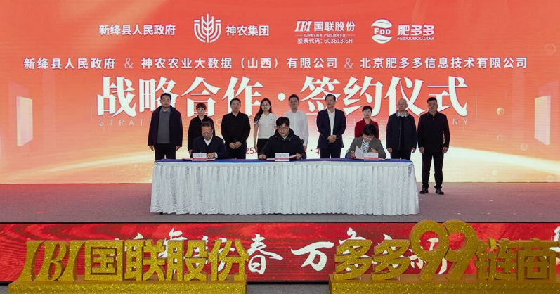 12月20日下午,山西省新绛县人民政府、国联股份肥多多、神农农业大数据(山西)有限公司(以下简称“神农集团”)在国联股份数字经济总部签订战略合作协议。新绛县副县长王星、肥多多硫酸铵供应链运营中心总监马彩平、神农农业大数据(山西)有限公司董事长兰瑞忠代表各方进行签约。