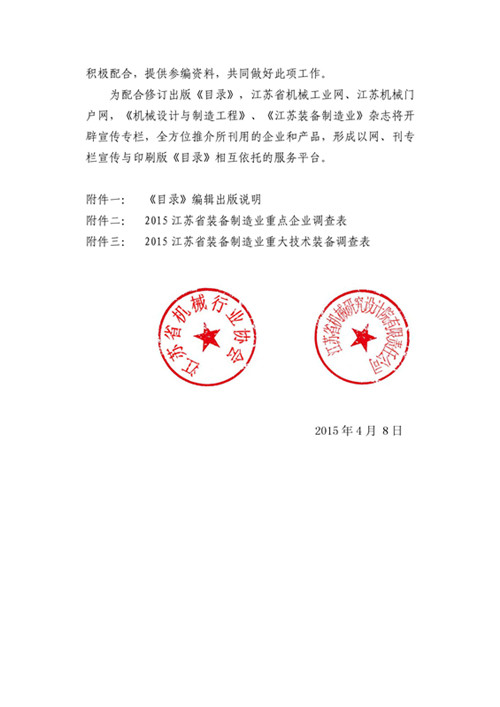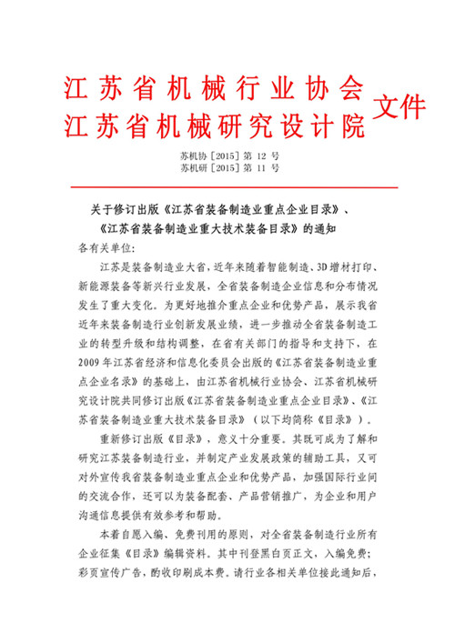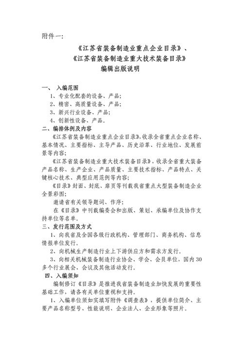 关于修订出版《江苏省装备制造业重点企业目录》、《江苏省装备制造业重大技术装备目录》通知