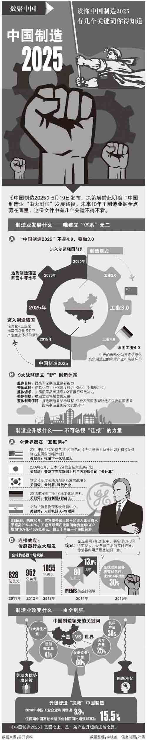 《中国制造2025》5月19日发布,决策层借此明确了中国制造业“由大到强”发展路径。未来10年里制造业掘金点藏在哪里,这份文件中有几个关键不得不看。