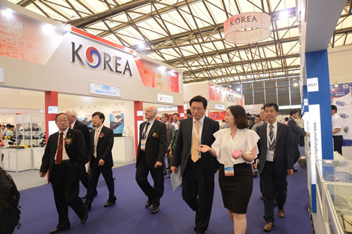 (2015年7月14日,韩国机械产业振兴会 会长兼主席 Ji Taik,Chung与韩国企业代表莅临EASTPO 2015展会现场 图片来源:上海东博文化发展有限公司)