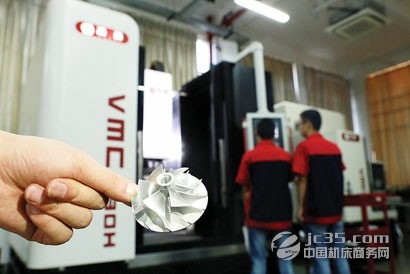 拓璞公司自主研发的五轴联动机床和用它制造的汽车涡轮增压器叶轮。叶轮具有复杂的几何结构,对加工工艺要求极高,五轴联动机床是目前唯一的制造工具。(章易镰/摄)