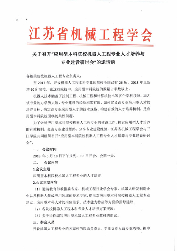 2018应用型本科院校机器人工程专业人才培养与专业建设研讨会邀请函