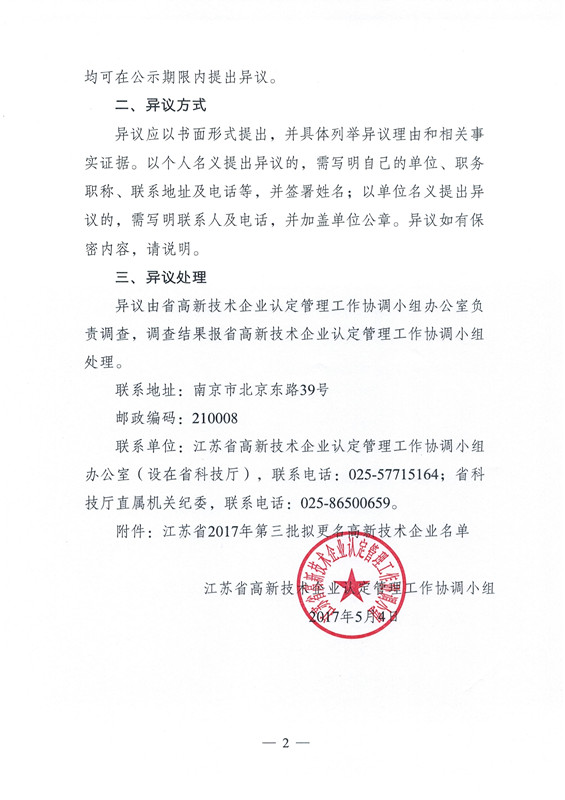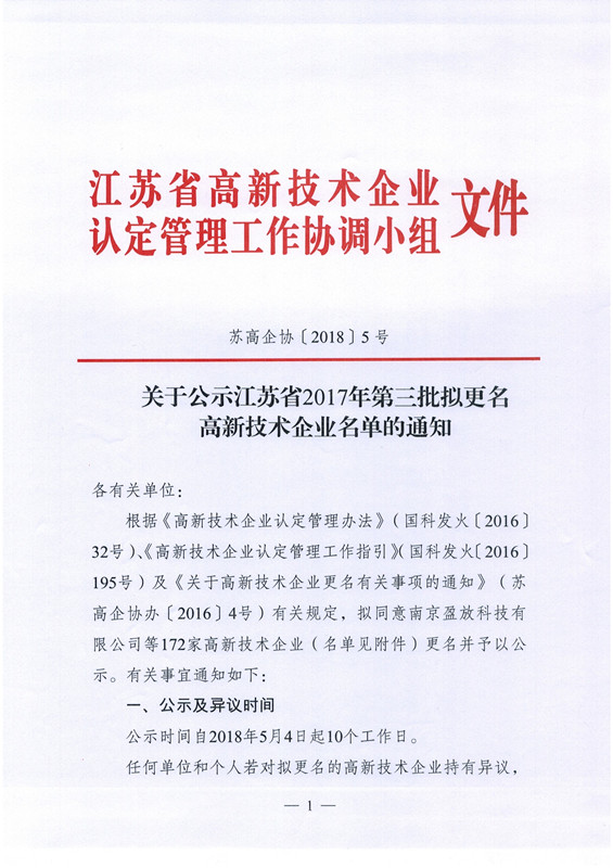 关于公示江苏省2017年第三批拟更名高新技术企业名单的通知