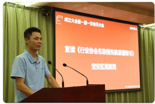 大会在雄壮的国歌声中开始,筹委会罗育银执行组长给大家介绍了协会筹备情况,宝安区民政局代表宣读了《行业协会名称预先核准通知书》,宝安区人民政府周学良副区长特别致辞。大会选举产生了第一届理事长、副理事长、理事、监事、秘书长等协会主要负责人。