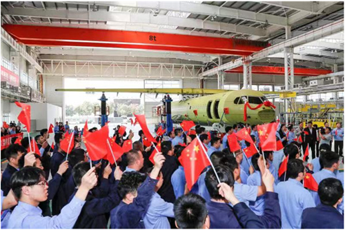 近百名新舟700参研人员参加了翼身对接仪式,在现场挥动国旗,合唱《我和我的祖国》,以此向伟大祖国表达民机人以坚忍不拔的信念、精益求精的态度为实现航空强国目标而不断奋斗的决心。