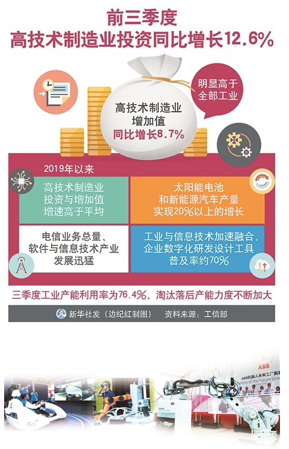 投资的增加也彰显了创新的活跃。前三季度,高技术制造业投资同比增长12.6%,明显快于制造业2.5%的投资增速。
