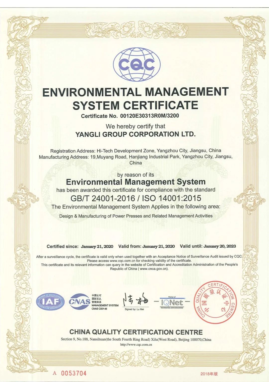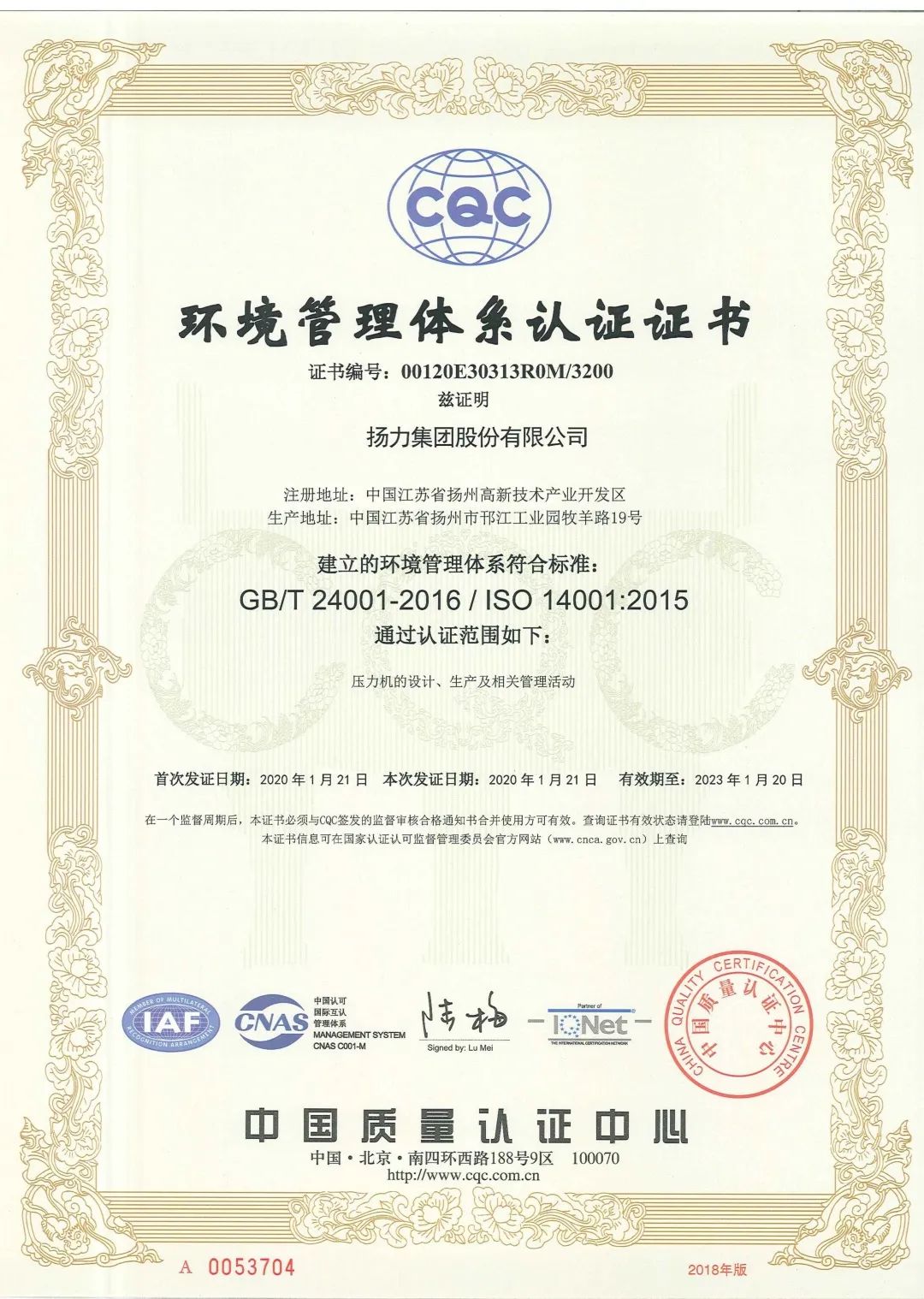 日前,扬力集团顺利通过ISO14001:2015环境管理体系认证,标志着扬力的管理运营质量和环境规范标准向着国际一线企业又迈进了一步!