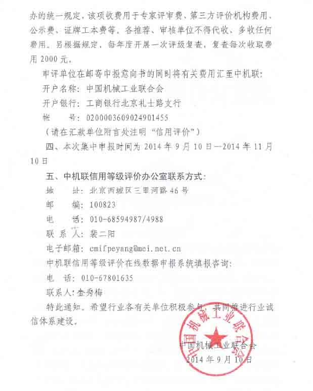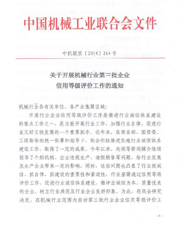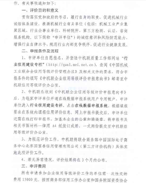 关于开展机械行业第三批企业信用等级评价工作的通知