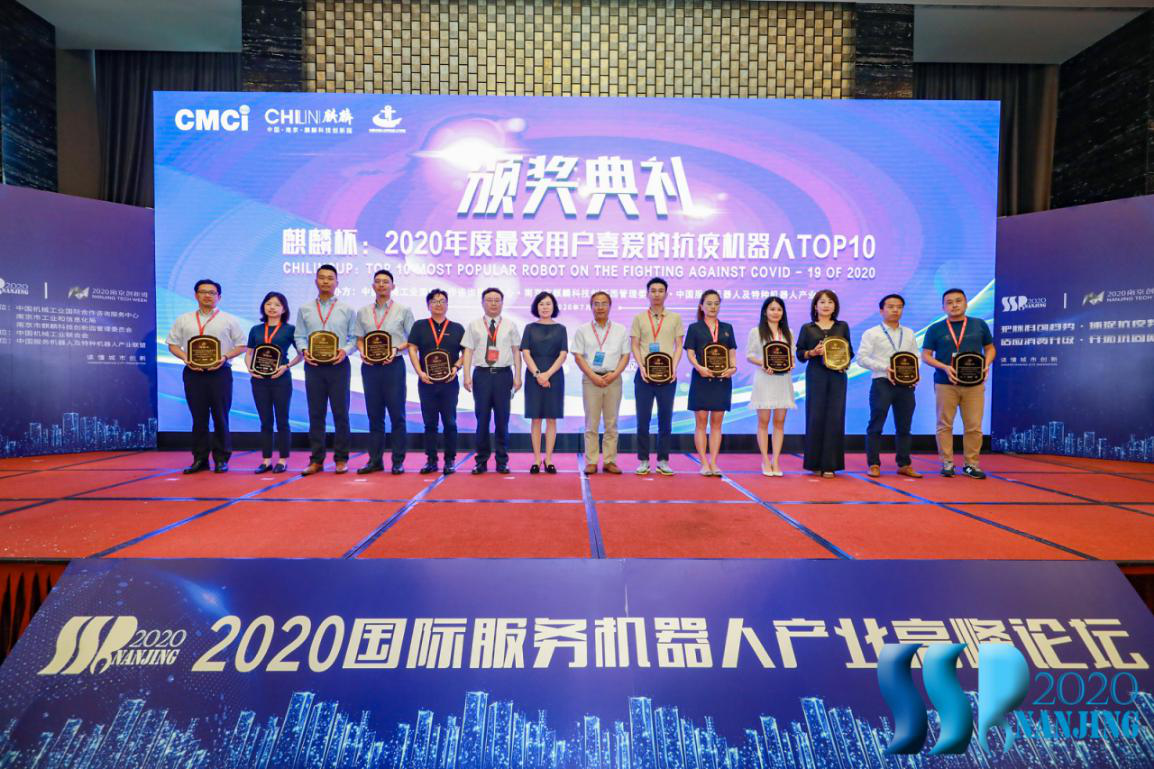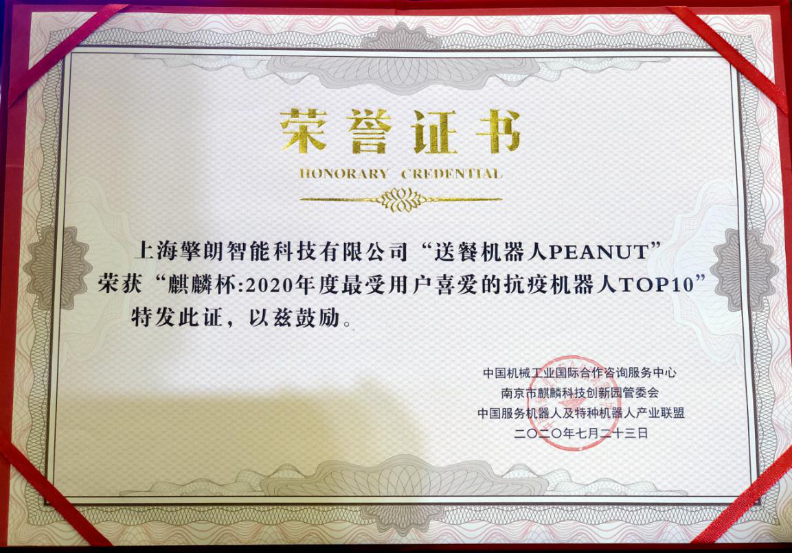 2020年7月23日,由中国机械工业国际合作咨询服务中心、南京麒麟科创园管委会、中国服务机器人及特种机器人产业联盟联合主办的2020第六届国际服务机器人产业高峰论坛暨“第三届麒麟杯颁奖典礼在南京举行。此次典礼上,全球室内无人配送机器人领军企业擎朗智能被授予“2020年度最受用户喜爱的抗疫机器人TOP10”荣誉证书。