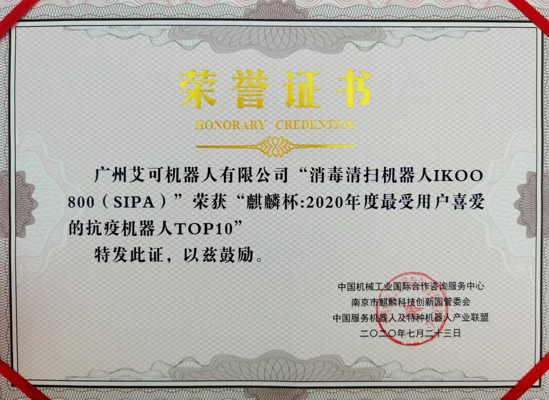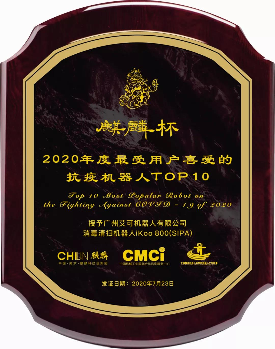 麒麟杯:2020年度最受用户喜爱的抗疫机器人TOP10荣誉证书 在疫情期间,艾可机器人“消毒清扫机器人”为疫情防控筑造了第一道防线,第一时间深入一线参与“抗疫”,驰援疫情高发地区湖北、北京、上海、广西、广东等省市的医院和隔离点,为现场提供日常消毒清扫服务,以AI人工智能守护一线人员的健康与安全,降低交叉感染的风险。