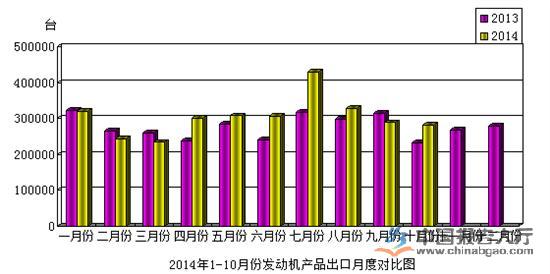 2014年10月份,发动机产品出口28.05万台,比去年同期增长了20.24%;出口金额1.42亿美元,比去年同期增长了22.90%。