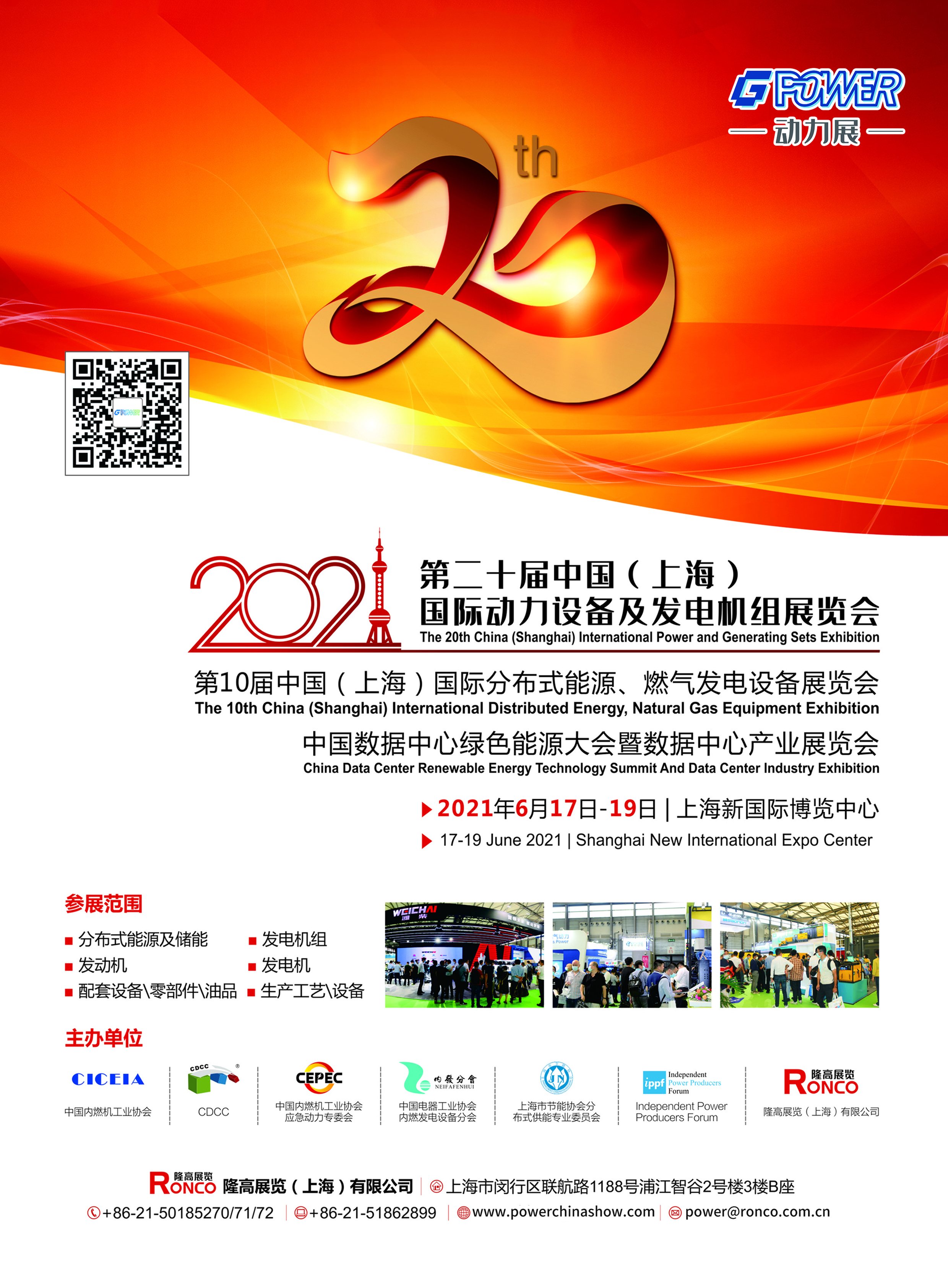 全球动力设备及发电机组行业发展风向标--上海国际动力设备及发电机组展览会(简称:GPOWER动力展),由中国内燃机工业协会、中国数据中心工作组(CDCC)、中国电器工业协会、中国内燃机工业协会应急动力装备委员会、中国电器工业协会内燃发电设备分会主办,隆高展览(上海)有限公司承办。第20届“GPOWER动力展”定于2021年6月17日-19日在上海新国际博览中心举办。