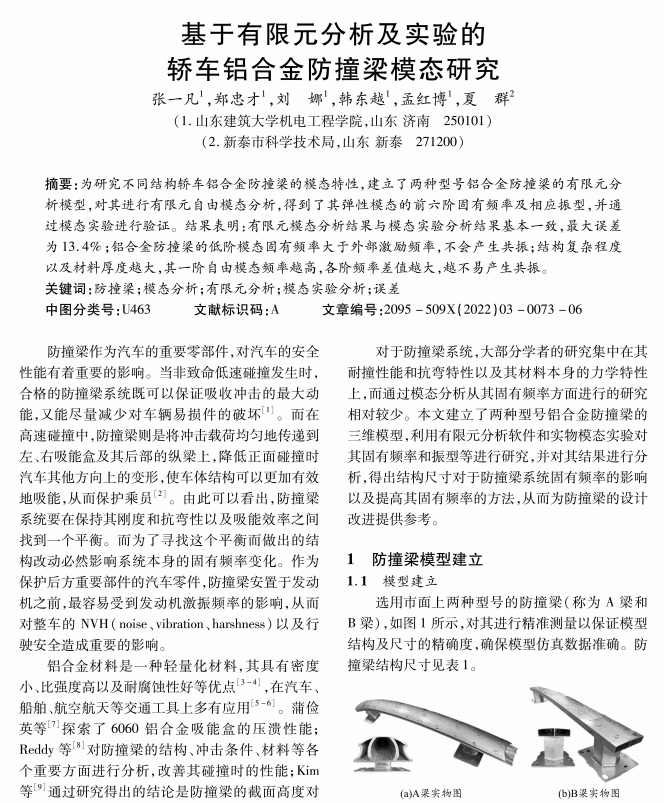 基于有限元分析及实验的轿车铝合金防撞梁模态研究
