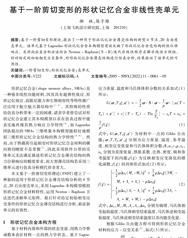 基于一阶剪切变形的形状记忆合金非线性壳单元