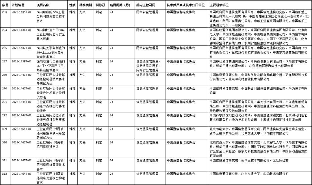近日,工信部发布《2022年第三批行业标准制修订和外文版项目计划》的通知(以下简称《项目计划》),共52项工业互联网相关标准被划分进新型基础设施标准项目计划表,其中,由工业互联网产业联盟(以下简称联盟)成员单位牵头研制的工业互联网网络领域行业标准分别为5G+工业互联网(4项)、边缘计算(4项)、时间敏感网络(4项)。