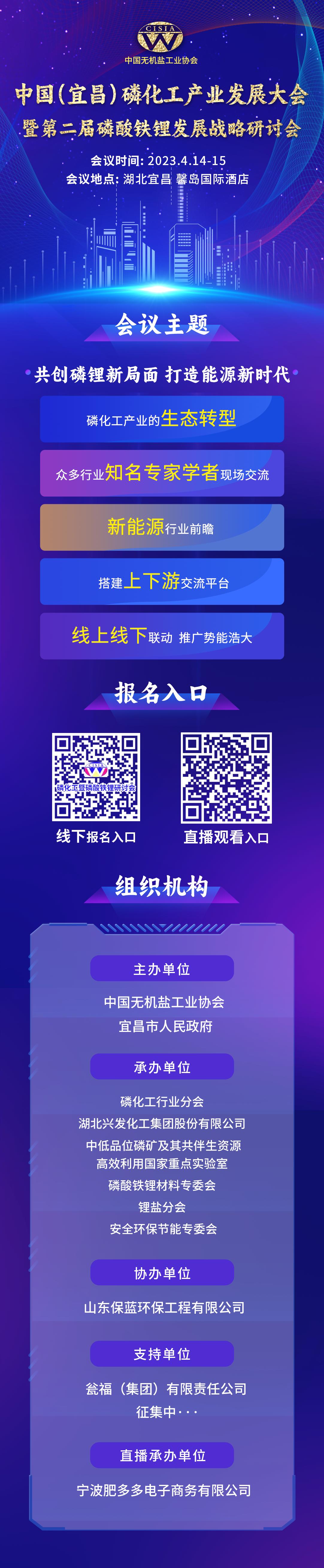 为进一步推动磷化工产业转型升级,促进磷系新能源材料发展,中国无机盐工业协会与宜昌市人民政府定于2023年4月14日,在宜昌市联合召开“2023中国(宜昌)磷化工产业发展大会暨第二届磷酸铁锂发展战略研讨会”;同期召开工信部原材料司组织的“磷化工先进制造产业集群发展”座谈会。