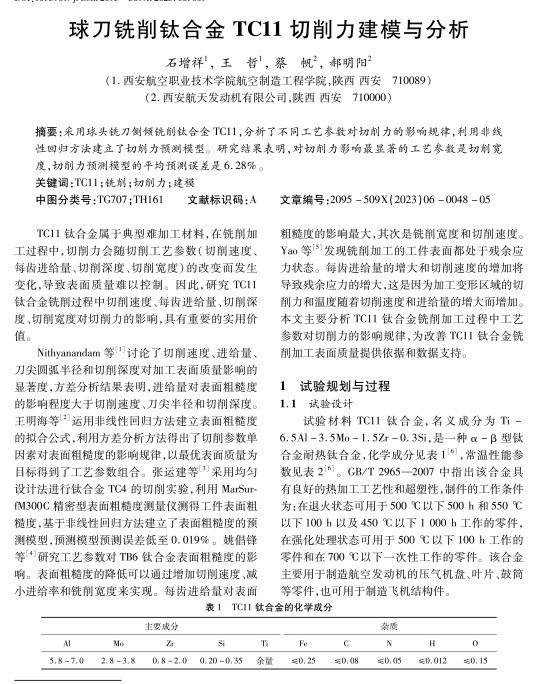 球刀铣削钛合金TC11切削力建模与分析