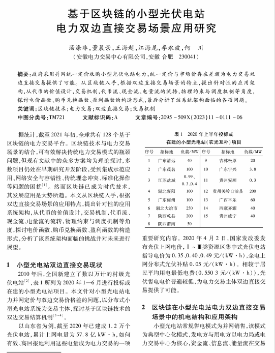 基于区块链的小型光伏电站电力双边直接交易场景应用研究