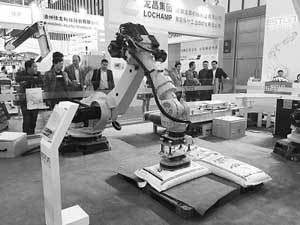 南京埃斯顿公司生产的机器人正在演示搬运饲料袋。本报记者 张希摄