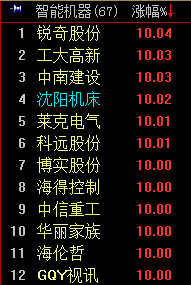 截至5月14日收盘,智能机器板块涨3.36%,板块中共有12只股票涨停。个股方面,锐奇股份、工大高新、中南建设、沈阳机床、莱克电气、科远股份、博实股份、海得控股、中信重工、华丽家族、海伦哲、GQY视讯12股涨停。