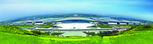 重庆国际博览中心(以下简称国博中心)是一座集展览、会议、餐饮、住宿、演艺、赛事等多功能于一体的现代化智能场馆。国博中心雄踞嘉陵江岸,拥有城市、森林、自然浑然一体的优美环境,是国内独一无二的公园展馆、人文展馆、生态展馆。
