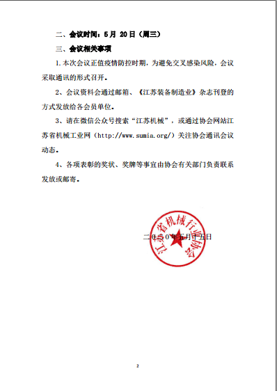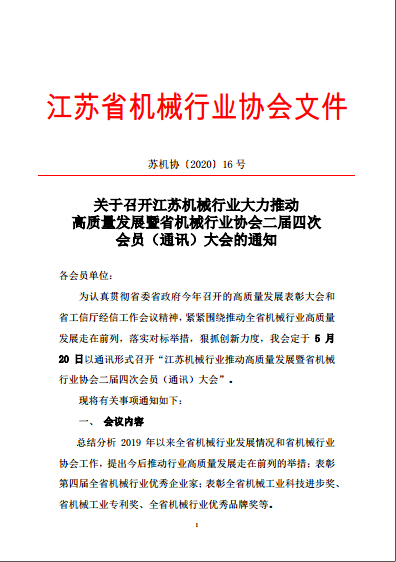 关于召开江苏机械行业大力推动高质量发展暨省机械行业协会二届四次会员(通讯)大会的通知