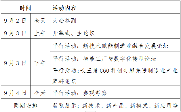(一)开幕式、主论坛 牵头单位:先进制造业大会组委会 主要内容:开幕致辞、主旨演讲、成果发布等。 邀请嘉宾:全体参会代表。 (二)参观考察 主要内容:参观考察长三角G60科创走廊规划展示馆、松江区重点智能制造产业基地、5G网络建设创新应用示范区、国家级智能制造重点实验室及智能制造试点示范项目企业等。