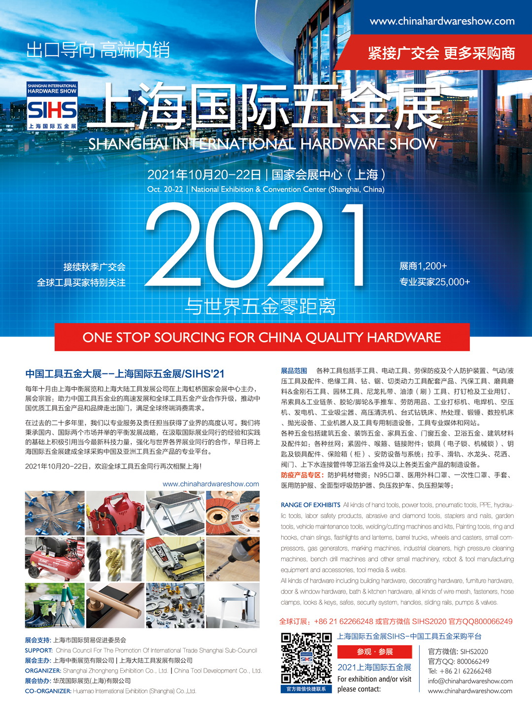 为深入贯彻习近平总书记关于稳住外贸外资基本盘的重要指示批示精神,落实党中央、国务院决策部署,做好“六稳”工作,落实“六保”任务,进一步加强稳外贸稳外资工作,稳住外贸主体,稳住产业链供应链的意见精神,上海国际五金展览会(SIHS)已于2020年10月20至22日在国家会展中心(上海虹桥)举办。